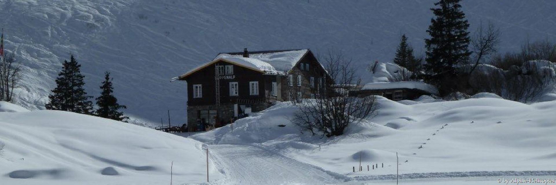 Nach gemütlichen 7 Minuten wandern im Pulverschnee erreichen wir zwei Berghäuser.